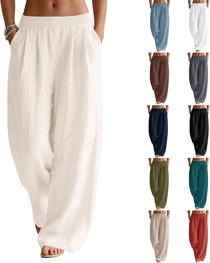 Wide Leg Linen Pants Women Summer Flowy Elastic Waist Palazzo Pants Loose Beach Vacation Travel Trousers with Pockets