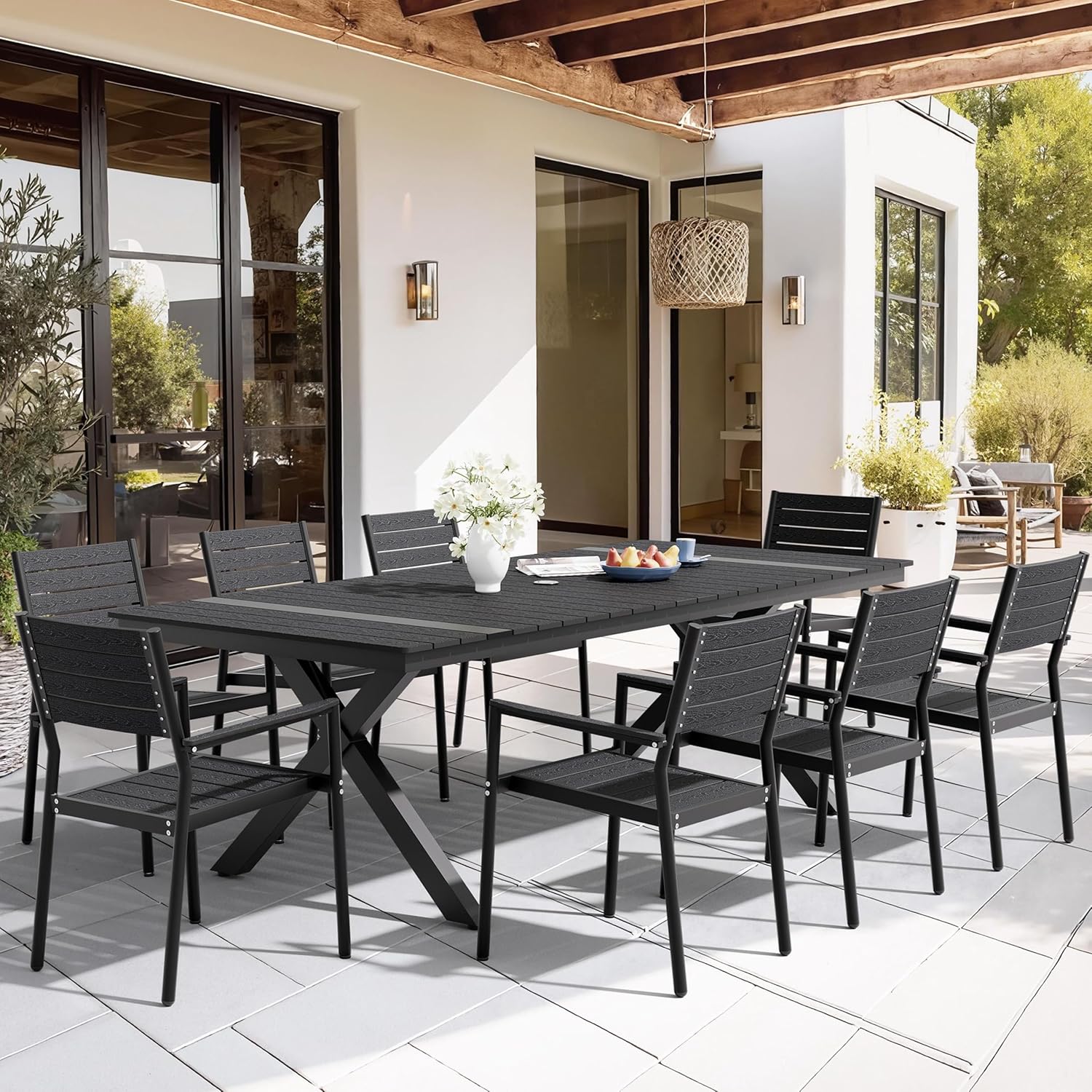 Pellebant Outdoor Dining Set for 8, 9 Pieces Aluminum Patio Table and Stackable Armrest Chairs with Umbrella Hole & Wood-Like Top, Black
