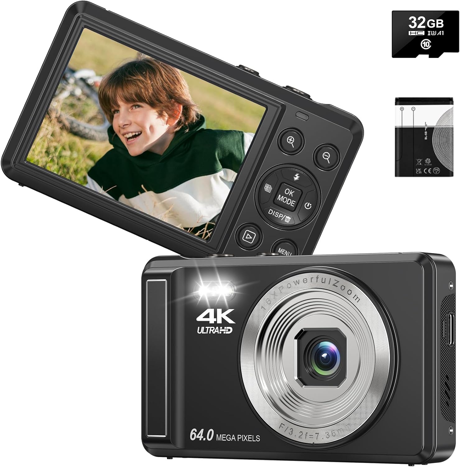 4K 64MP Digital Camera with 32GB Card, 16X Digital Zoom, Compact Camera Camera with 2 Batteries for Beginners