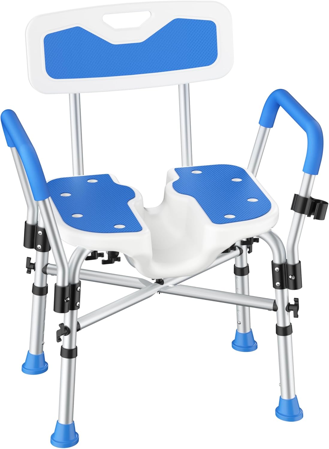 500lb Heavy Duty Shower Chair with Arms & Back- Blue Padded Bath Seat with Cutout for Elderly